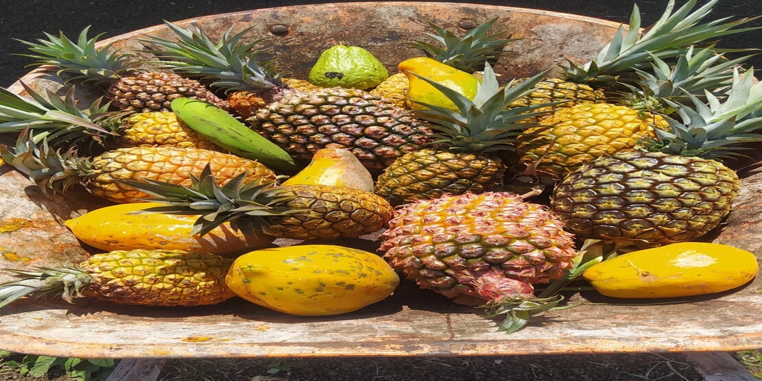 Bananes, papayes, oranges, citrons, mandarines, ananas, mangues, avocats, grenades, noix de cocos, chirimoyas, mûres, goyaves, guava machete, caimite, dattes, guanabana, pera noruega, cannes à sucre, ciruelas, café ...